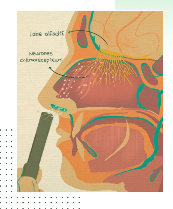 D’une part, parce que les huiles essentielles sont directement transportées vers nos poumons lors de l'inhalation, ce qui permet une diffusion rapide des essences par les alvéoles pulmonaires dans l’ensemble de notre organisme, d’autre part, parce que nos neurones chémorécepteurs olfactifs sont situés contre la paroi nasale supérieure. Ces derniers profitent donc d’un accès direct à notre lobe olfactif (région du cerveau), ce qui améliore considérablement l’efficacité de l’ancrage.